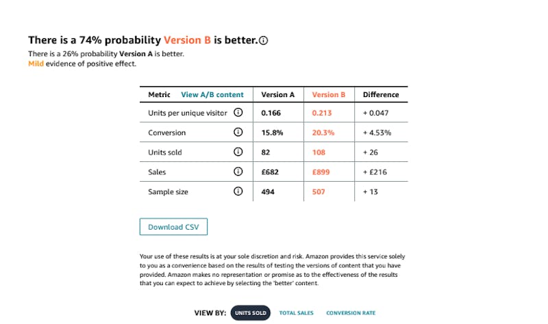 Version B showed a clear improvement over Version A across all key metrics. Units sold per unique visitor increased by 28.3%. The conversion rate improved from 15.8% to 20.3%, an increase of 28.5%. Total units sold rose from 82 to 108, reflecting a growth of 31.7%. Additionally, total sales revenue increased from £682 to £899, a growth of 31.7%. The results showed that there was a 74% chance that the new images (Version B) performed better than the old ones (Version A).