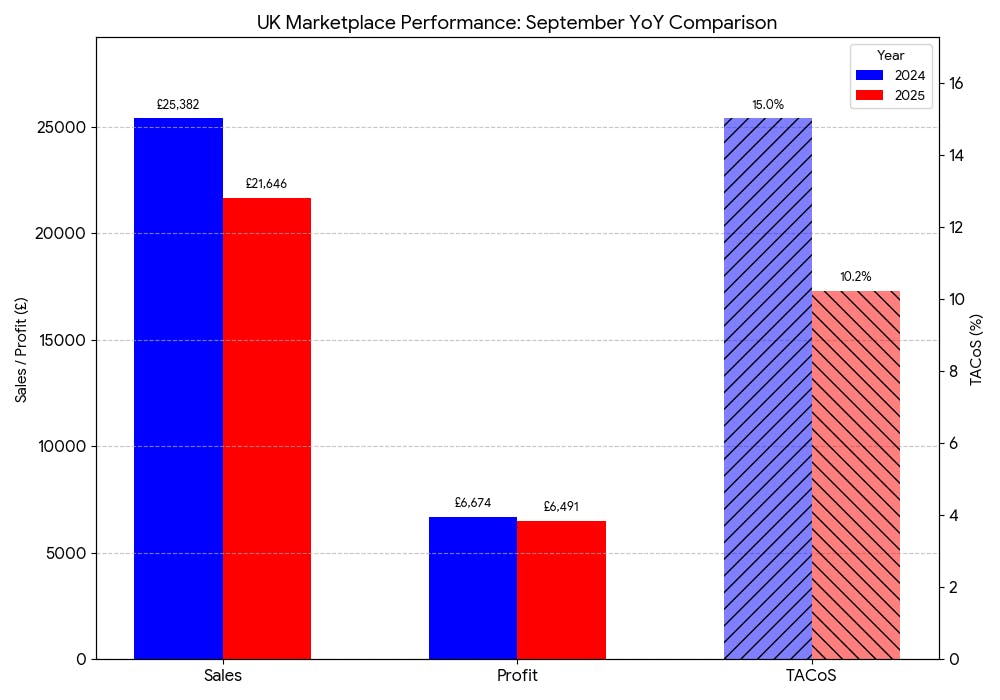 The results of this focused approach showed quickly. While total UK sales were lower compared to last year, overall profit remained stable. This was achieved by reducing ad spend and focusing on high-performing targets. As a result, TACoS dropped from 15% to 10%, showing that profitability and long-term growth were prioritized over short-term sales.