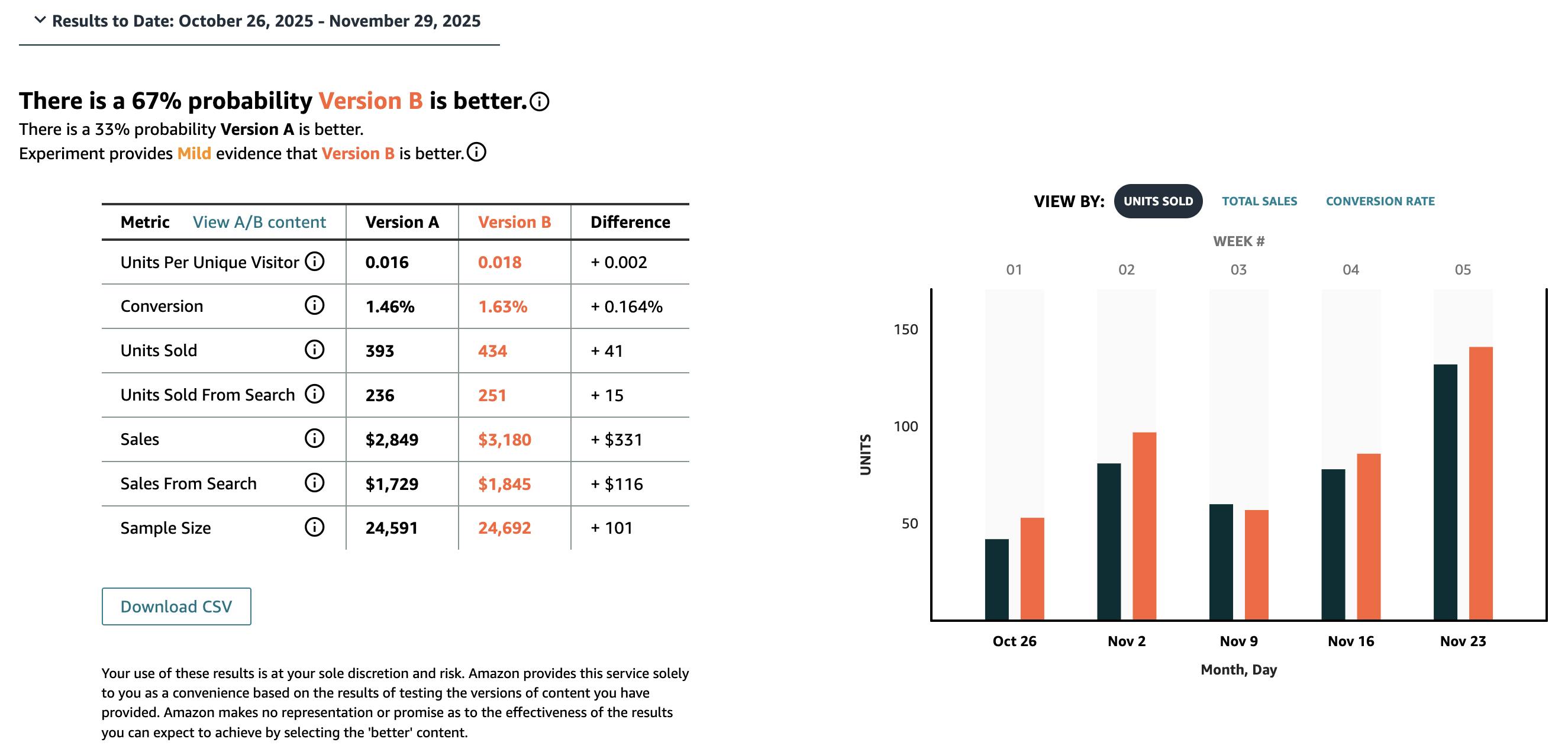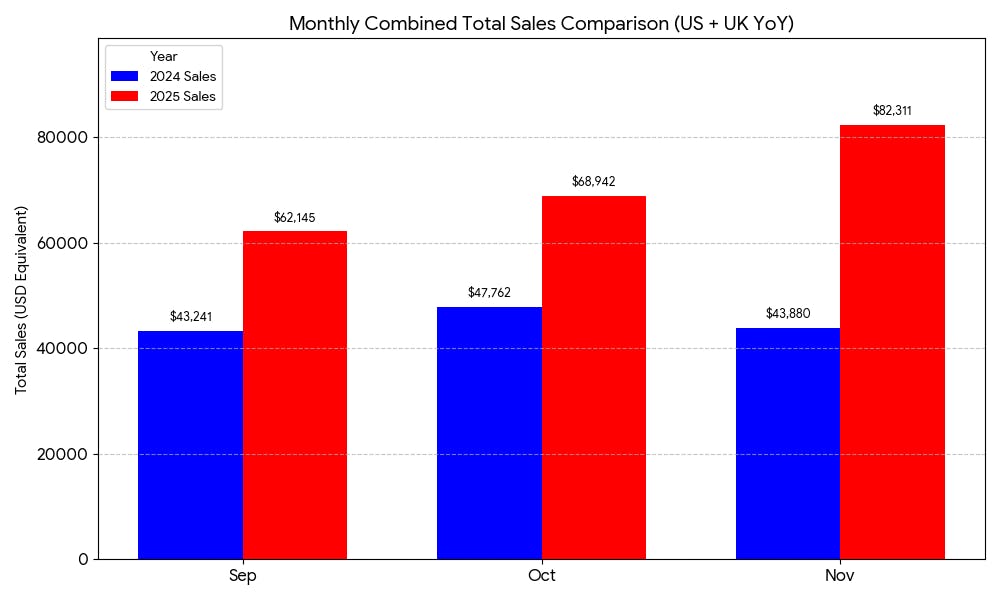 November was a strong month, with both the US and UK reaching their sales targets. In the US, we achieved several product-level goals. A core product and its variations saw strong sales growth, and another key product returned to profitability. This led to four record weeks in a row and the highest monthly sales to date, reaching $47k.